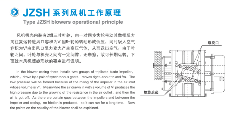 一.螺旋形状是20°以上的固定螺旋方式。机壳的进排风屏蔽线切入螺旋,以转子顶端光面线构成的三角形进排风口,通过转子的旋转而循序打开。本风机的进排风口,不像旧式罗茨螺旋风机那样在瞬间打开或关闭,所以运转声音极小,几乎没有排风脉动。