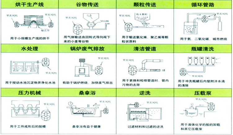 升压高;具备吸入和鼓出的双向功能,既可以用作吸风,也可以用作吹风;机壳内部不需要油类润滑,所以输出的介质清洁;采取了避免轴承润滑油、齿轮润滑油流入机壳内部的密封机构形式(应按行业标准进行包装)